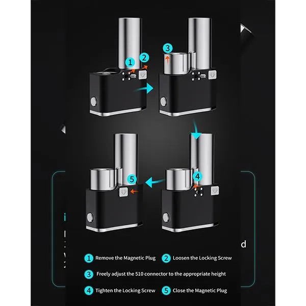 Der höhenverstellbare 510er Anschluss aus Edelstahl erlaubt die präzise Anpassung an den verwendeten Verdampfer. Die Höhe der 510er Base kann bis zu 13.0 mm verändert und mit einer Schraube gesichert werden, die sich hinter einem magnetisch befestigten Edelstahlplättchen mit dem Telli’sMod-Logo befindet. So entsteht eine optisch und funktional harmonische Einheit zwischen Mod und Verdampfer.
